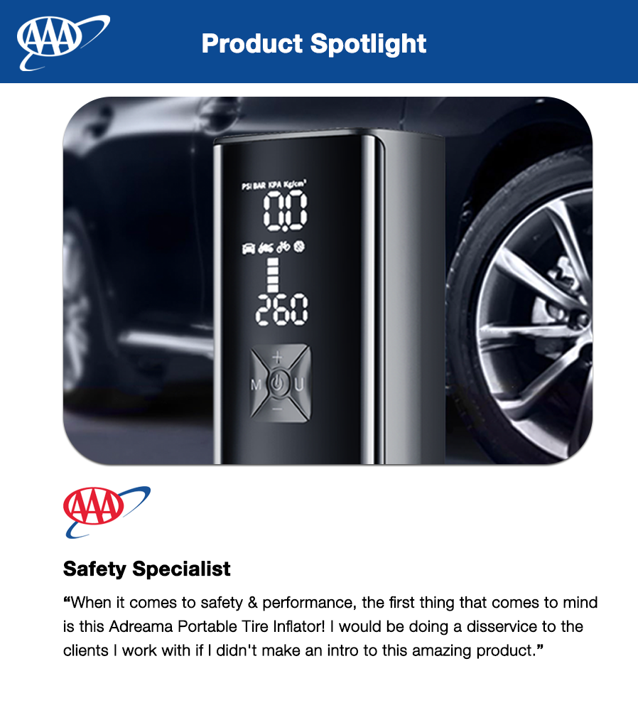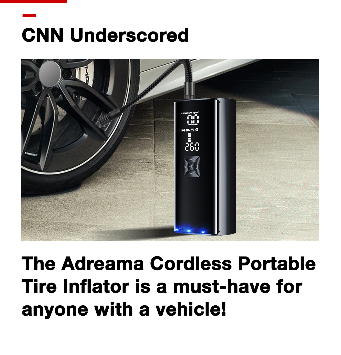 The Adreama Cordless Portable Tire Inflator is a versatile and convenient tool for emergencies or daily needs. Its compact design makes it easy to store and use, while the full digital display provides accurate tire pressure readings and battery levels. With its phone charging functionality and LED flashlight, it's a multifunctional device ready for various situations. Equipped with a range of nozzles and charging cables, it's a comprehensive solution for inflating tires, sports equipment, and more.
